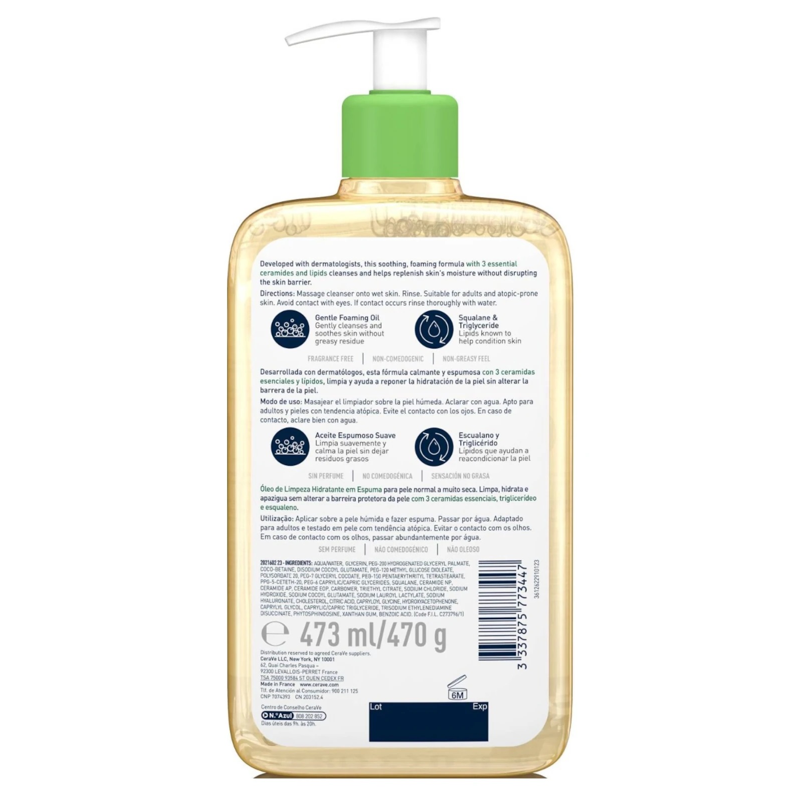 فوم شستشوی روغنی سراوی مدل Hydrating Foaming Oil حجم 473 این محصول فرمولی مغذی دارد که به آرامی پوست را پاکسازی میکند. ترکیبات گیاهی فوم روغنی سراوی، پوست را تغذیه کرده و آن را برای مدت طولانی هیدراته نگه میدارد. افرادی که پوست بسیار خشک و حساس دارند، بدون نگرانی میتوانند از فوم شستوشوی CeraVe استفاده کنند. این فوم رویکردی ملایم داشته و بدون از بین بردن سد پوستی آلودگیها را پاک میکند. فوم شستشو آبرسان پوست خشک سراوی حاوی روغنهای اسکوالان و تری گلیسیریدها است که چربیهای طبیعی پوست را مجددا بازسازی کرده و موجب نرمی و لطافت پوست میشود.هیالورونیک اسید موجود در این شوینده صورت CERAVE، علاوهبر آبرسانی پوست، رطوبت را نیز در آن قفل میکند. فرمول این فوم شستوشو دارای نیاسینامید هست که به تغذیه و ترمیم پوست کمک خواهد کرد. این محصول توسط متخصصان پوست طراحی شده و برای پوستهای ظریف، حساس و مستعد اگزمای خفیف مناسب است. این پاک کننده گیاهی دارای pH خنثی بوده و انتخاب خوبی برای پوستهای مستعد آلرژی و نوزادان نیز هست. در ساخت پاک کننده روغنی ابرسان CeraVe از صابون، پارابن، عطر و مواد با منشاء حیوانی استفاده نشده است.